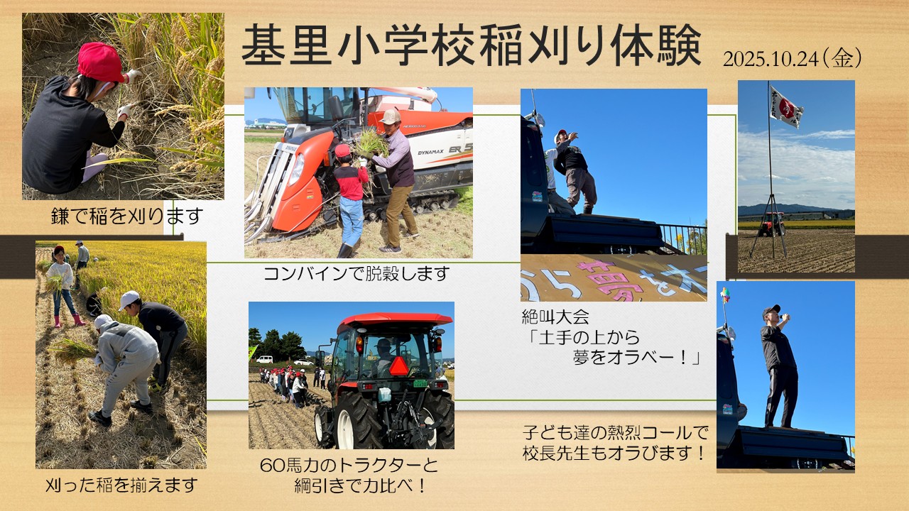 令和7年10月24日(金)、結農の里「はる」の学習田で基里小学校5年生の稲刈りが行われました。