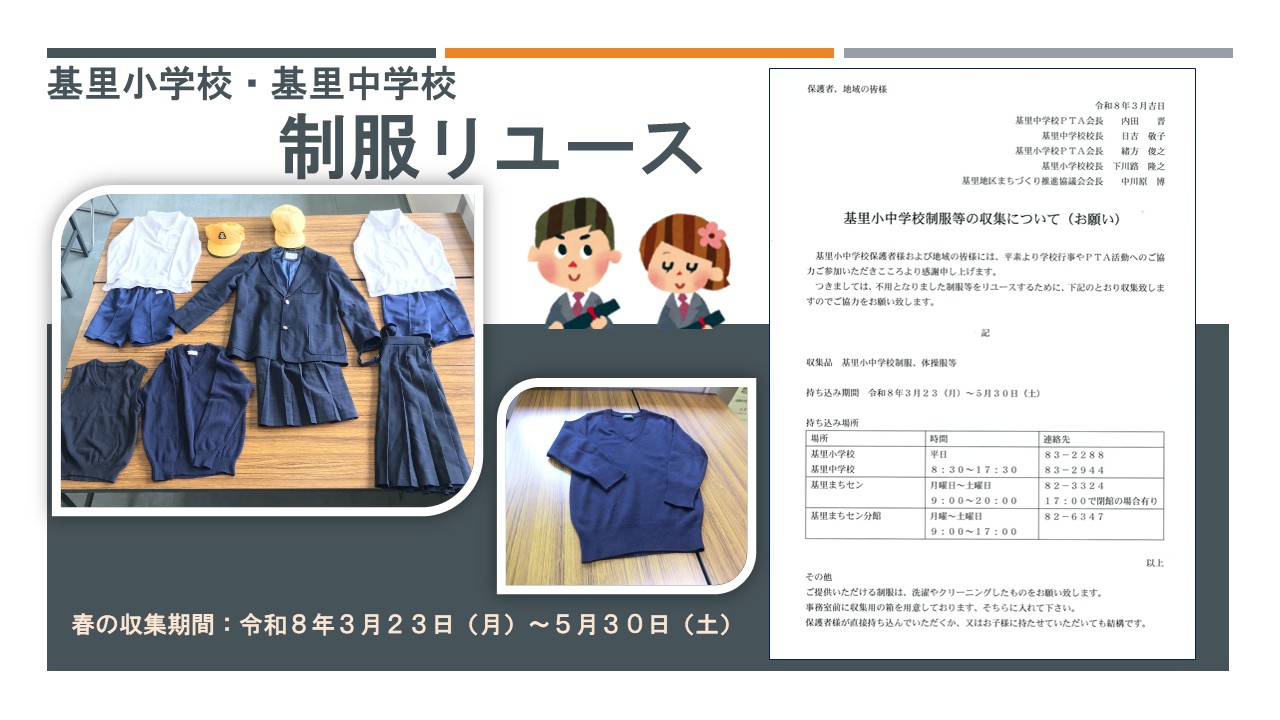 基里地区まちづくり推進協議会は、基里小学校の制服リユース(再利用)のための収集活動に協力しています。
